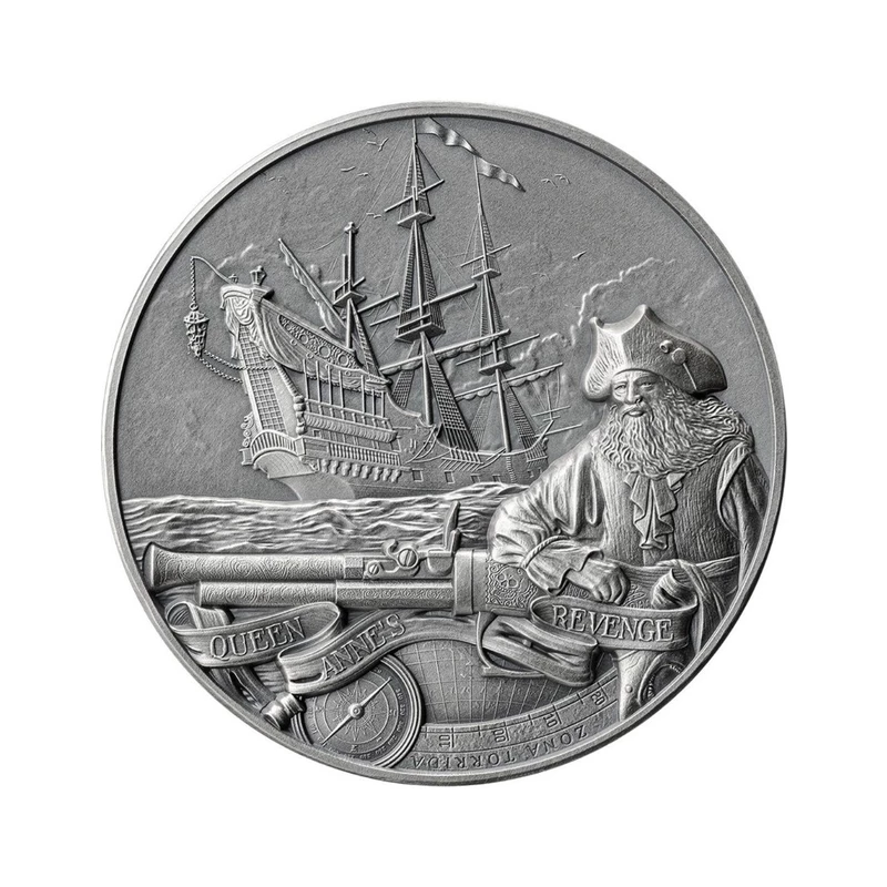 A unique silver coin from the "Captains of Fortune" series, dedicated to the legendary pirate ship "Queen Anne's Revenge".