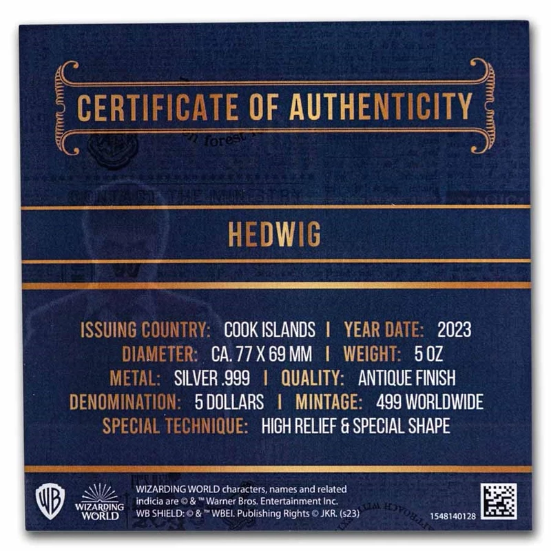 Cook Islands silver coin "Hedwig", 2023, 155.5g, pure silver (0.999 proof)