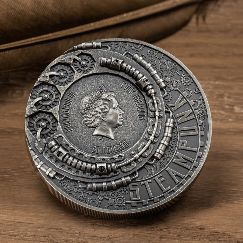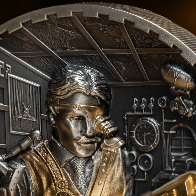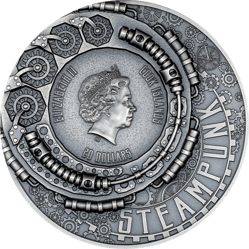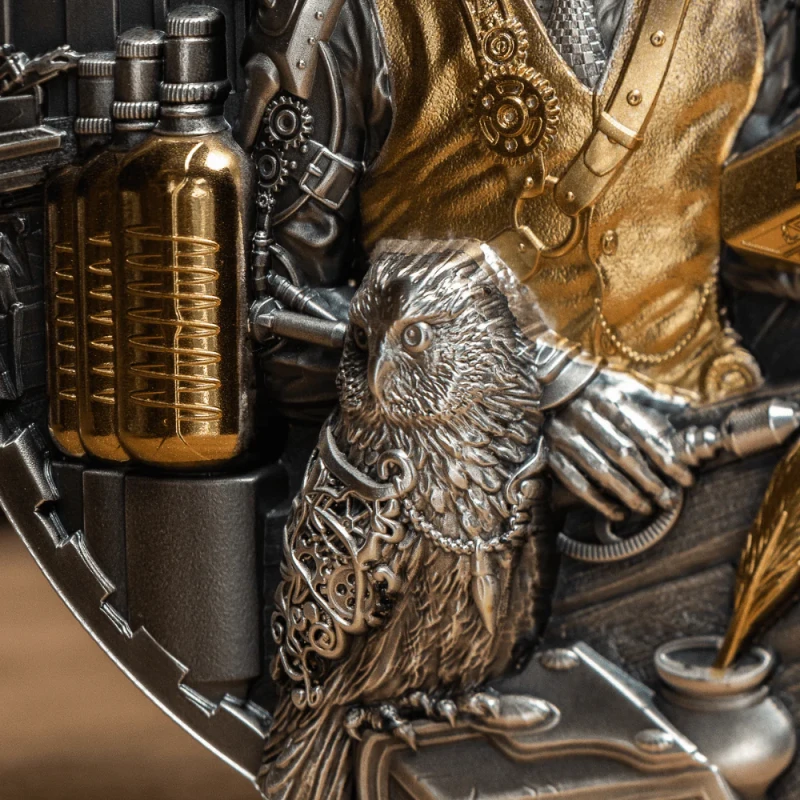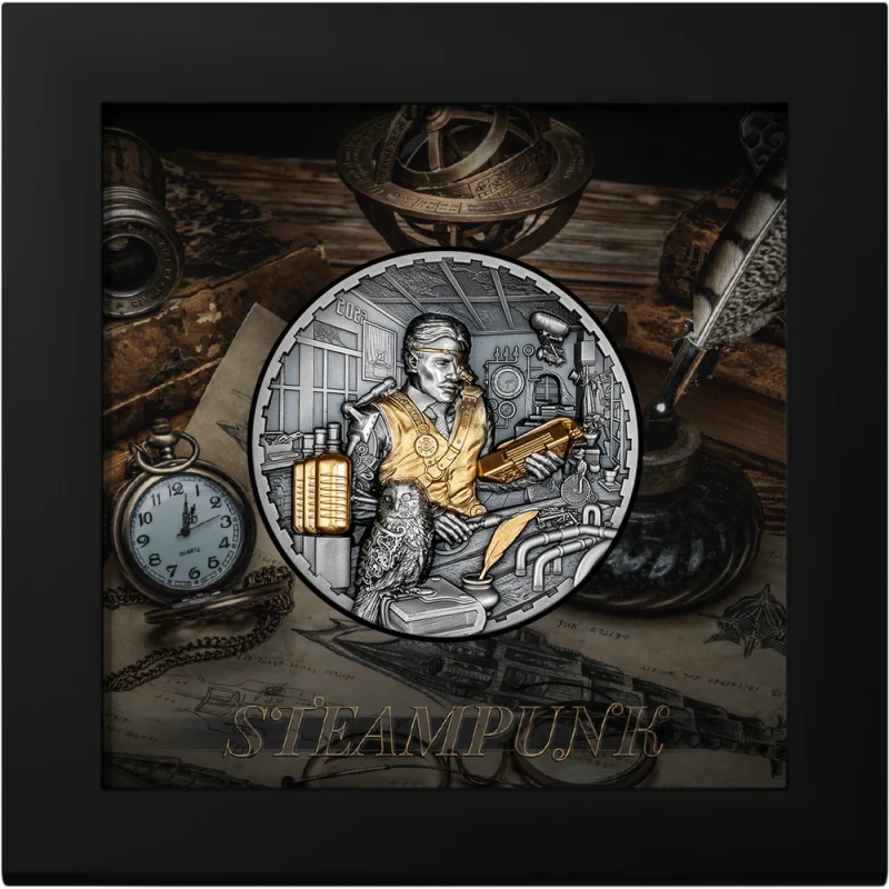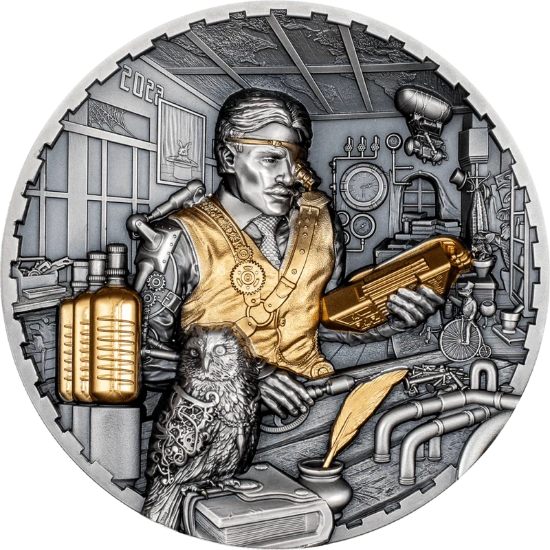 Exclusive silver coin with a lot of fine details and very high relief minting. The coin, in steampunk style, depicts a conqueror of the sea floor, in an armored diving suit, against the background of a departing submarine and a variety of technogenic and mechanical creatures inhabiting the sea and ocean depths.