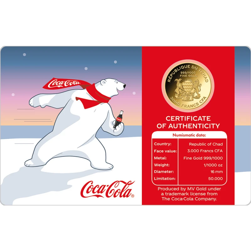 Chada gold coin "Coca-Cola. Polar bear" (proof), 0.031 g. pure gold (0.999 proof)