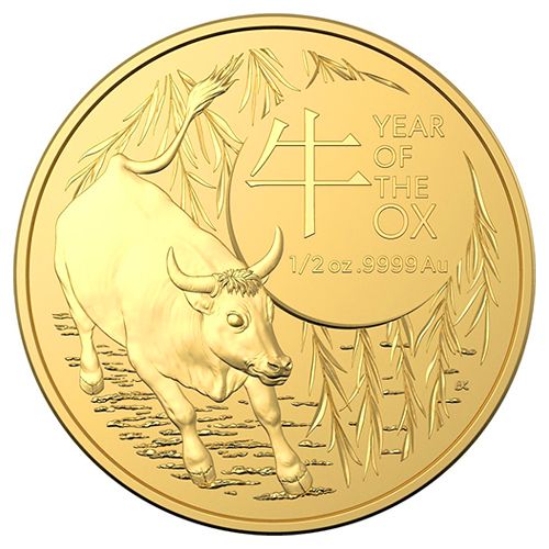 Australijska złota moneta Lunar III. Rok Wołu o wadze pół uncji trojańskiej (Królewska Mennica Australijska).