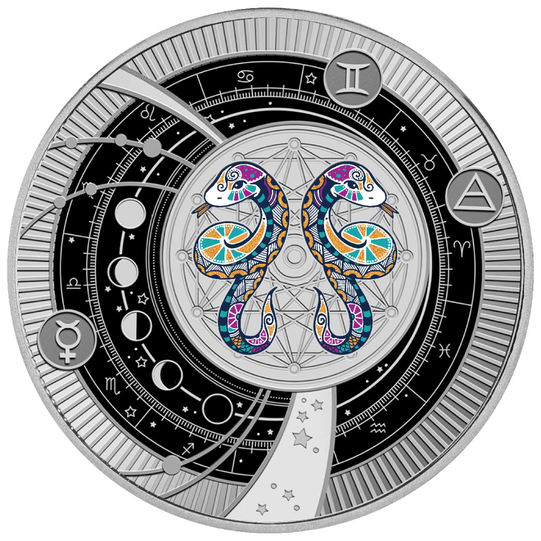 Ta elegancka srebrna moneta z serii "Znaki Zodiaku" poświęcona jest Bliźniętom, znakowi, który uosabia dwoistość, ciekawość i nienasycone pragnienie nowych doświadczeń. Bita w jakości Proof, zachwyca jasnym kolorem i wyjątkowymi detalami. Szczególną cechą monety jest elegancki pierścień z zawieszką, dzięki któremu można ją nosić jako stylową biżuterię. Rewers przedstawia dwa węże, symbolizujące lustrzaną jedność dusz i magiczną energię Bliźniąt. Moneta jest wydawana w etui z certyfikatem autentyczności i jest ograniczona do zaledwie 599 sztuk na całym świecie.
