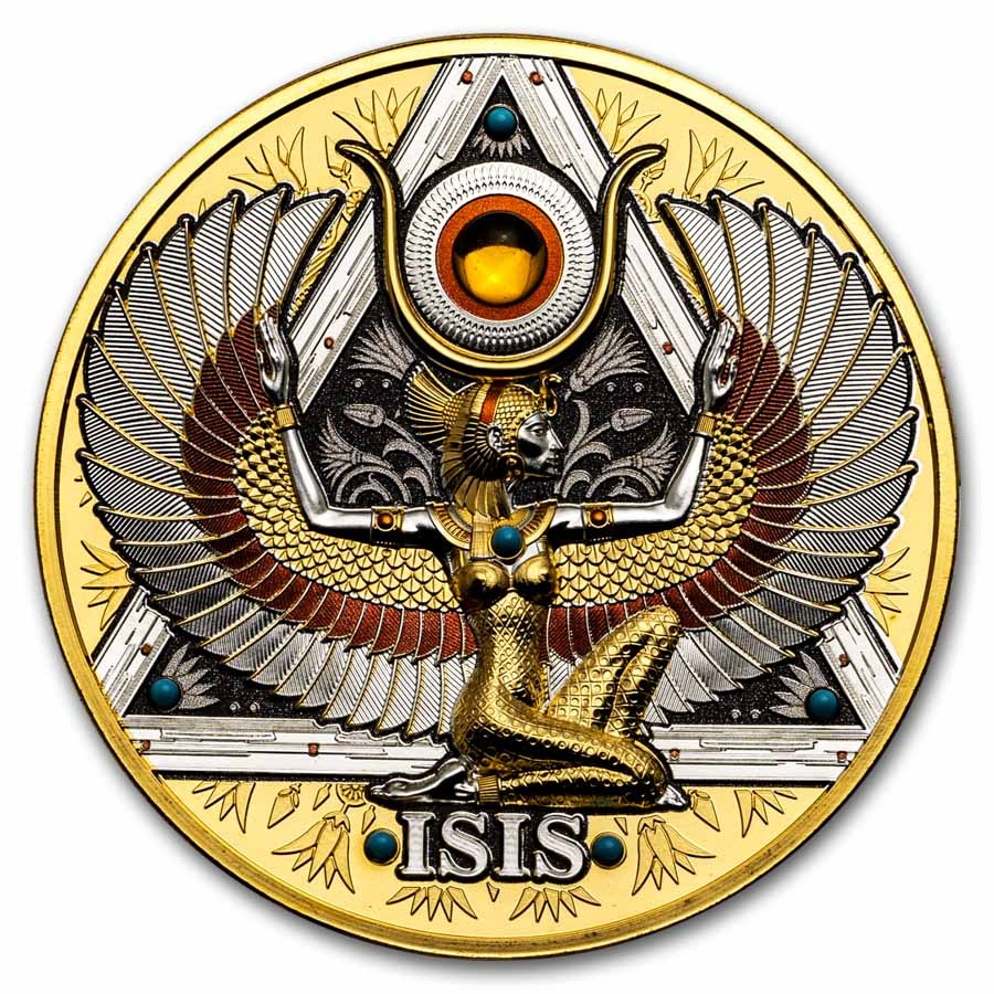 Ta imponująca srebrna moneta jest częścią serii "Golden Greatness" i jest poświęcona starożytnej egipskiej bogini Izydzie, bóstwu macierzyństwa, magii i ochrony.