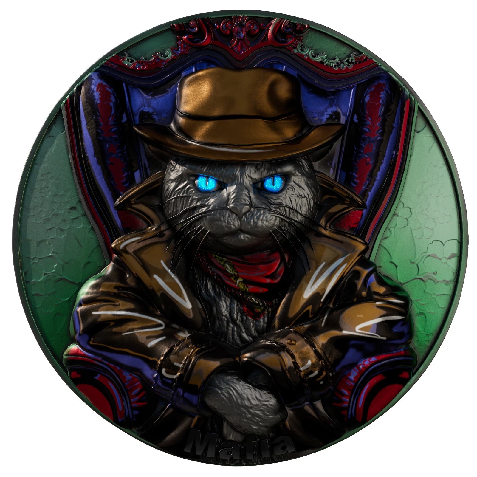 Ta imponująca srebrna moneta o wadze 2 uncji rozpoczyna serię "Meow", poświęconą charyzmatycznym i niebezpiecznym członkom kociego świata. Rewers przedstawia majestatycznego kociego szefa mafii, promieniującego pewnością siebie i zimną wyższością. Ze zwężonymi oczami, przechylonym kapeluszem i władczą postawą emanuje siłą i nieokiełznanym instynktem. Moneta ma antyczne wykończenie i wysoki relief, który podkreśla każdy szczegół projektu. Specjalny element świeci w ciemności, dodając dodatkową nutkę tajemniczości. Moneta jest wydawana w stylowym etui z certyfikatem autentyczności i jest limitowana do 199 sztuk na całym świecie.