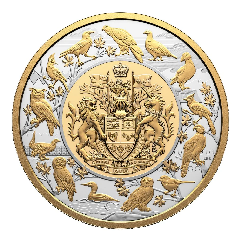 Ta imponująca moneta kolekcjonerska została wybita z 5 uncji czystego srebra i pokryta selektywnym złotem. Rewers przedstawia nowy herb Kanady zaprojektowany przez artystkę Cathy Bursey-Sabourin, oficjalną wersję używaną obecnie w całym kraju. Jego duża średnica 65 mm pozwala w pełni docenić zawiłe szczegóły heraldyczne, w tym dekoracyjne obramowanie przedstawiające 13 prowincjonalnych i terytorialnych ptaków, tworzących symboliczny i bogaty wizualnie "krajobraz" Kanady. Każda moneta jest prezentowana w etui Royal Canadian Mint z seryjnym certyfikatem autentyczności. Nakład jest ograniczony do 1300 sztuk.