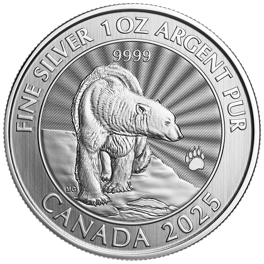 Srebrna moneta "Majestatyczny Niedźwiedź Polarny" z Królewskiej Mennicy Kanadyjskiej jest poświęcona jednemu z najbardziej kultowych symboli Arktyki. Rewers przedstawia niedźwiedzia polarnego stojącego na krze lodowej, zwróconego w stronę odcisku pojedynczej łapy, podczas gdy tło jest wzbogacone dynamicznymi, stylizowanymi promieniami. Projekt ten kontynuuje temat poprzednich emisji, przedstawiając dojrzałe i niezależne młode niedźwiedzia, co jest subtelnie wzmocnione przez odcisk samotnej łapy w kompozycji. Moneta została wydana w nakładzie 20 000 sztuk i jest prezentowana w blistrze z certyfikatem autentyczności.