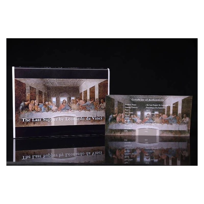Unikalna srebrna moneta wyemitowana przez Kamerun przedstawia obraz największego artysty Leonarda da Vinci - "Ostatnia Wieczerza". Obraz przedstawia ostatnią wieczerzę Jezusa Chrystusa z uczniami. Wieczór, podczas którego przemienił wodę w wino i opowiedział wszystkim o swojej przyszłości. Na awersie monety znajduje się portret Leonarda da Vinci, a także herb Kamerunu i rok emisji monety.