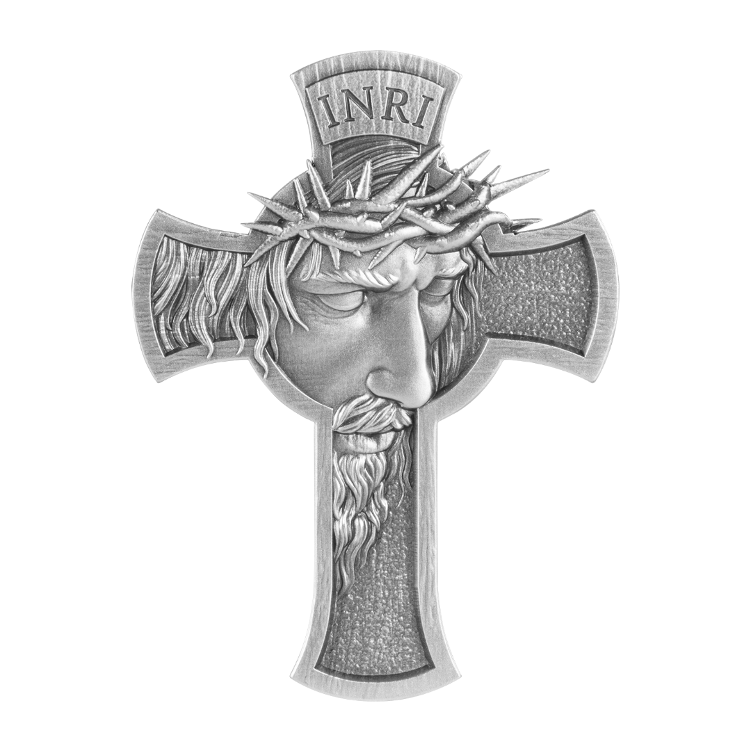 Ta wyjątkowa srebrna moneta o wadze 1 uncji ma kształt krzyża i upamiętnia centralny symbol wiary chrześcijańskiej, ukrzyżowanie Jezusa Chrystusa. Rewers przedstawia twarz Zbawiciela w koronie cierniowej z oszałamiającymi szczegółami, odzwierciedlającymi Jego cierpienie, współczucie i duchową siłę. Moneta ma antyczne wykończenie i indywidualny numer seryjny, który podkreśla jej ekskluzywność. Wydana w limitowanej edycji zaledwie 500 sztuk na całym świecie. Dostarczana w tematycznym etui z certyfikatem autentyczności.