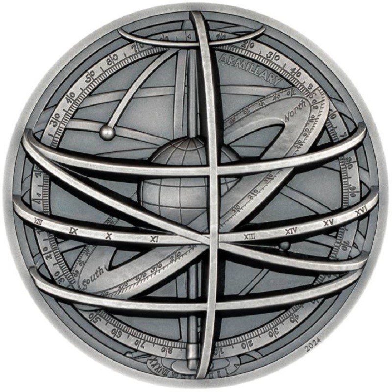 Wyspy Cooka: srebrna moneta kolekcjonerska Instrumenty historyczne. Sfera Armilarna 2024 (ultra wysoki relief), 62,2 g czystego srebra (0,9999)