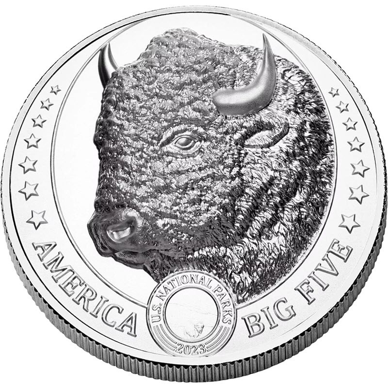 Wyemitowana w 2023 roku kolekcjonerska srebrna moneta z Fidżi jest wybita z 1 uncji srebra o próbie 0,999 i stanowi część serii Wielka Piątka Ameryki. Moneta ta honoruje potężnego amerykańskiego bizona. Wykonany z wyraźnym reliefem projekt wyróżnia się głębią i precyzyjnie wyrzeźbionymi detalami. Rewers przedstawia imponujący portret głowy żubra, otoczony stylizowanym ornamentem z gwiazd, który wzmacnia amerykański motyw. Silny relief wzmacnia poczucie objętości i obecności. Dzięki limitowanemu nakładowi wynoszącemu zaledwie 3000 sztuk, moneta ta jest niezwykle atrakcyjna dla kolekcjonerów.