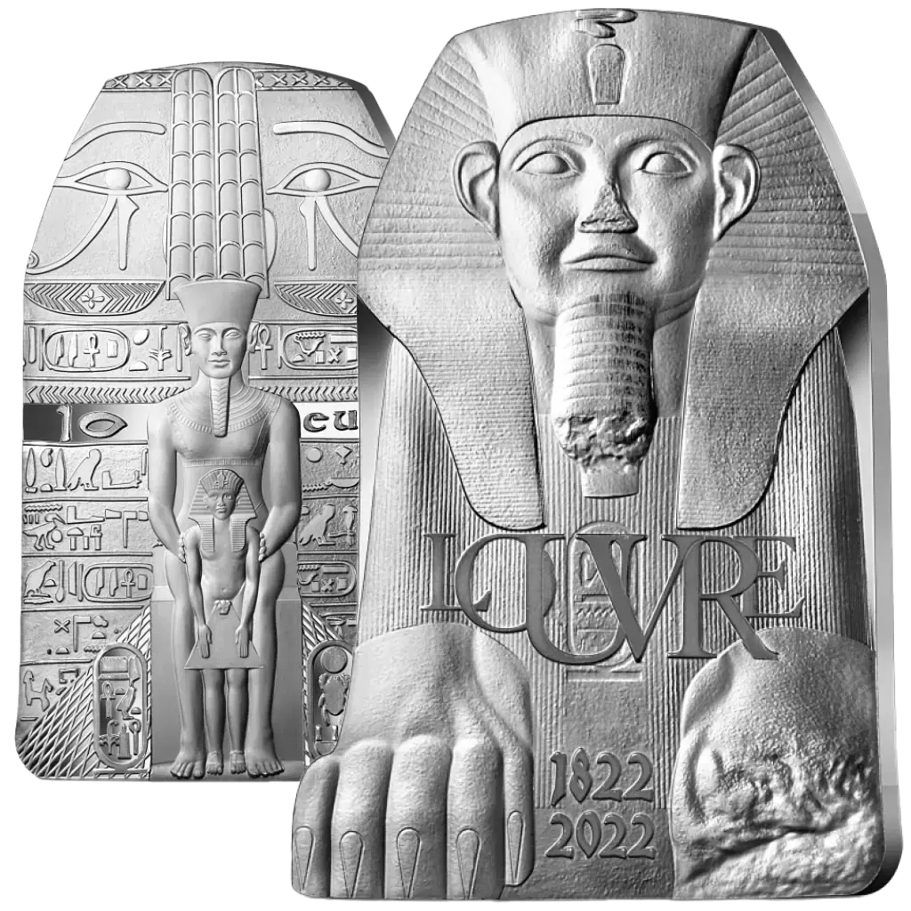 Wyemitowana w 2022 roku przez Monnaie de Paris we współpracy z Muzeum Luwru srebrna moneta Proof zawiera 22,2 g czystego srebra o próbie 0,999. Nominał wynosi 10 euro, a nakład jest ograniczony do 5000 sztuk. Wydanie stanowi część serii French Excellence, celebrującej dwie historyczne instytucje położone na przeciwległych brzegach Sekwany. Moneta poświęcona jest tematowi "Skarby Egiptu" i upamiętnia 200. rocznicę odszyfrowania hieroglifów (1822-2022) oraz 100. rocznicę odkrycia grobowca Tutenchamona. Jego kształt odwzorowuje Wielkiego Sfinksa z Tanis wystawionego w Luwrze. Rewers przedstawia pozłacaną brązową skrzynię boskiego czciciela Shepenupeta, z bogiem Amonem przedstawionym wzdłuż centralnej osi, obserwującym młodego Tutanchamona. Piramida pojawia się na dole jako symbol ciągłości dziedzictwa, obok kartuszy Tutanchamona. Wartość nominalna i inicjały RF są wyświetlane w centrum, wraz ze znakiem mennicy.