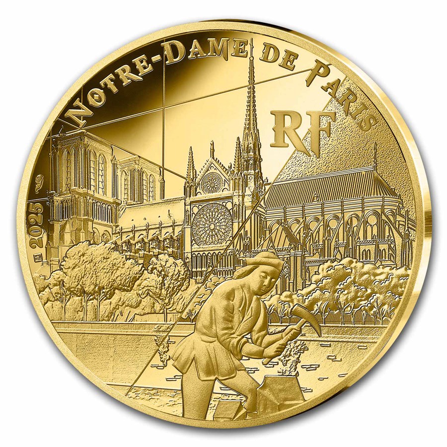 Francuska złota moneta kolekcjonerska z 2025 roku upamiętnia katedrę Matki Bożej w Paryżu, symbol duchowego i kulturowego dziedzictwa, który przetrwał wieki i tragiczny pożar w 2019 roku. Wyemitowana w ramach serii UNESCO, jest bita jako Proof w 1 uncji złota próby 0,999 w limitowanej edycji zaledwie 1000 sztuk. Awers monety przedstawia średniowiecznego murarza na tle katedry Notre-Dame de Paris - ze szczegółami i schematycznymi liniami nawiązującymi do jej budowy i rekonstrukcji. Rewers przedstawia wizerunek kuli ziemskiej z elementami symbolizującymi miejsca światowego dziedzictwa i stylistycznie przypomina napisy na Kamieniu z Rosetty. Moneta jest dostarczana w oryginalnym pudełku z certyfikatem autentyczności.