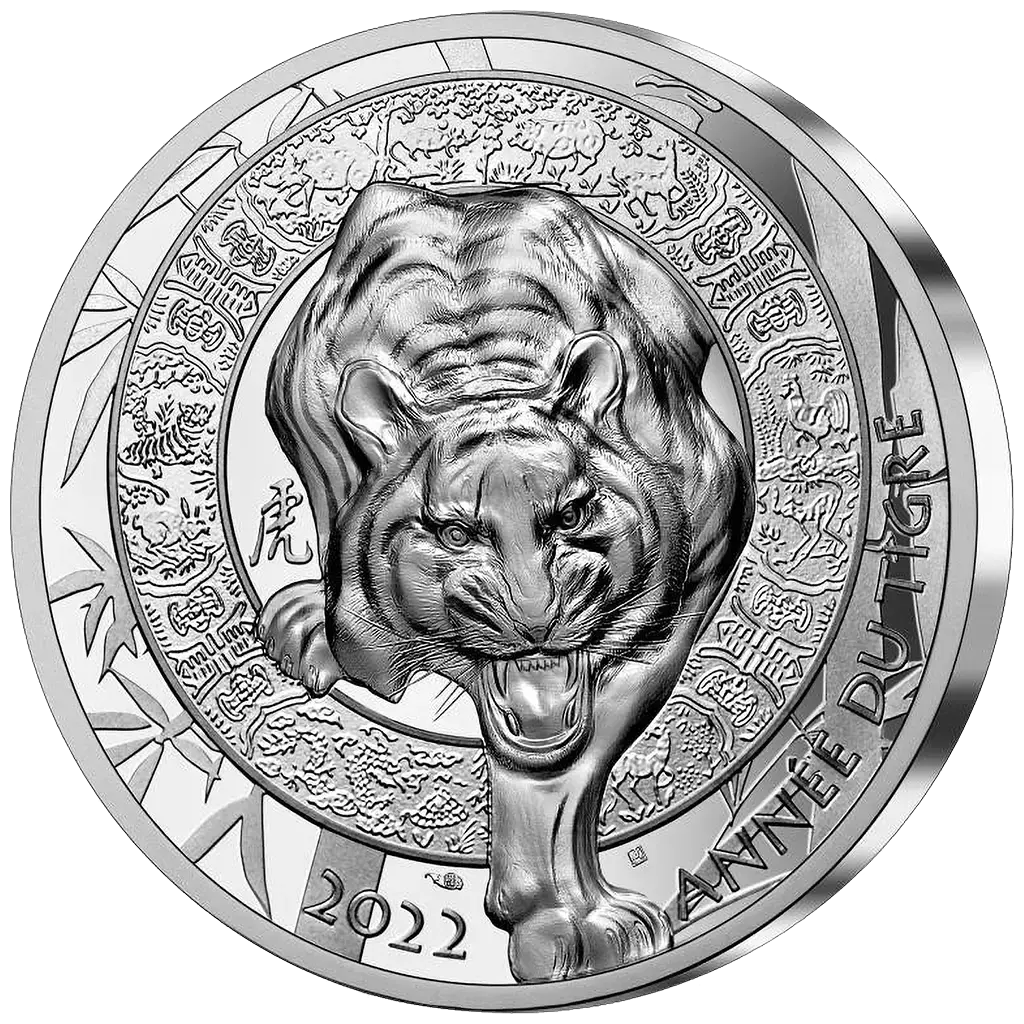 Wybita w jakości Proof z czystego srebra o próbie 0,999 i wadze 1 uncji, ta kolekcjonerska moneta kontynuuje serię chińskiego kalendarza emitowanego przez Monnaie de Paris. Wydanie z 2022 roku świętuje Rok Tygrysa, trzeci znak chińskiego zodiaku, tradycyjnie kojarzony z odwagą, siłą, niezależnością i potężnym przywództwem. Rewers monety przedstawia Tygrysa otoczonego pierścieniem tradycyjnych chińskich motywów. Zwierzę wydaje się poruszać po monecie poprzez wzór drzwi świątyni, który wizualnie łączy się z awersem. Po lewej stronie znajduje się ideogram Tygrysa, wykaligrafowany przez artystę Xian Ying Honga. Rok 2022 i napis Rok Tygrysa pojawiają się wzdłuż zewnętrznego okręgu. Awers przedstawia wszystkie dwanaście zwierząt chińskiego zodiaku ułożonych wokół tradycyjnych drzwi chińskiej świątyni. Wartość nominalna 20 euro znajduje się w lewym górnym rogu, podczas gdy inicjały RF pojawiają się na samych drzwiach. Nakład jest ograniczony do 3000 sztuk.
