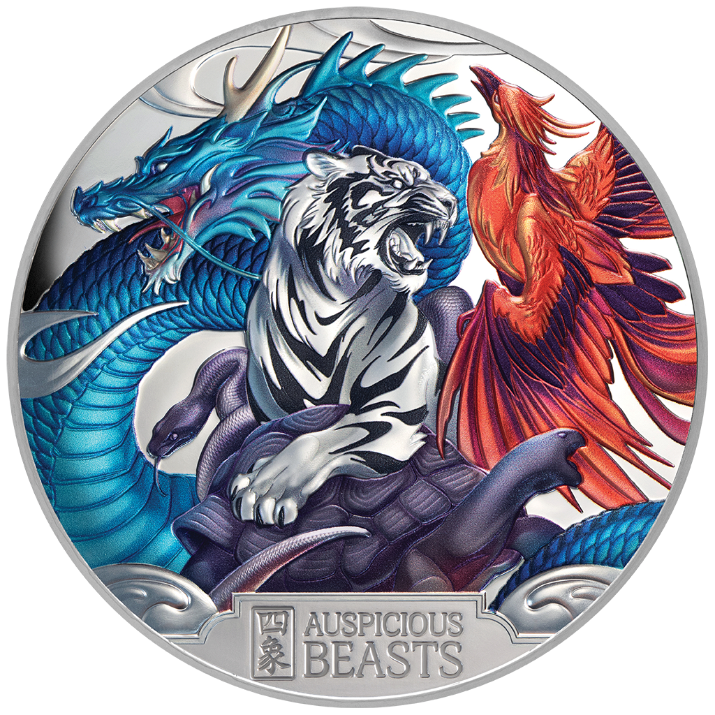 Ta imponująca srebrna moneta o wadze 5 uncji ucieleśnia ducha starożytnej mitologii i moc Czterech Pomyślnych Bestii: Lazurowego Smoka, Błękitnego Ptaka, Białego Tygrysa i Czarnego Żółwia. Ich dynamiczne formy łączą się w potężną kompozycję, w której ciepłe ogniste odcienie przeplatają się z chłodnymi niebieskimi odcieniami. Wybita w jakości Proof moneta wyróżnia się głębią reliefu i grą światła, która podkreśla każdy szczegół legendarnych strażników. Moneta jest prezentowana w eleganckim etui i towarzyszy jej certyfikat autentyczności. Nakład jest ściśle ograniczony do 388 sztuk na całym świecie.