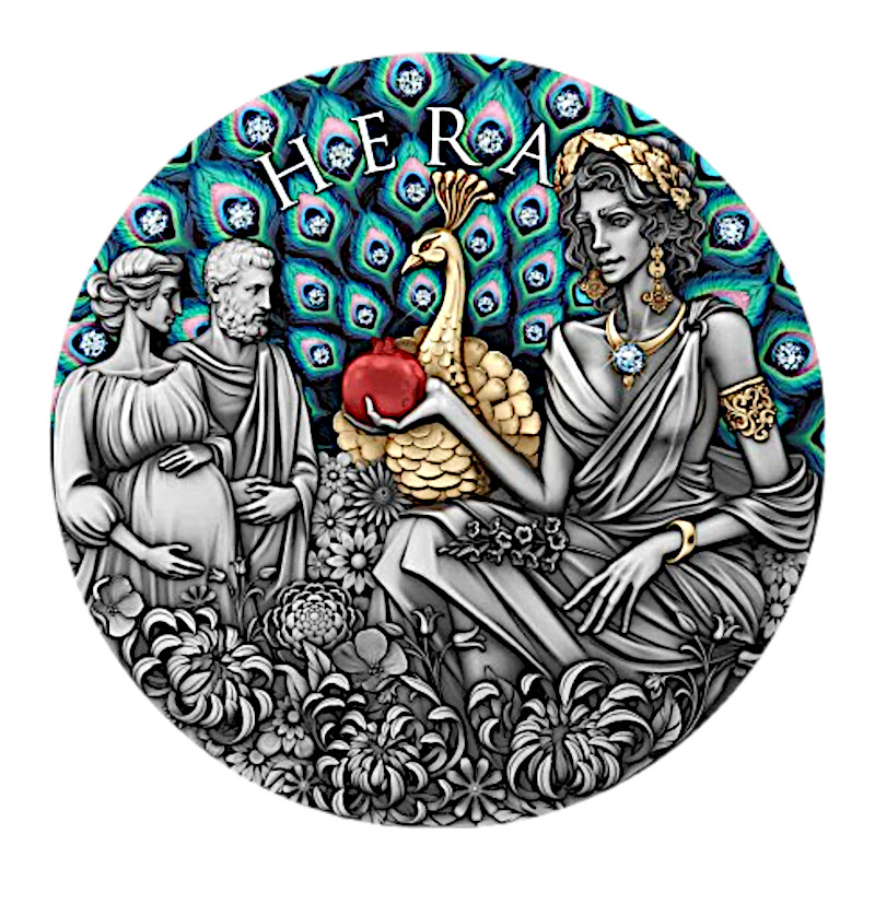 Ta wspaniała srebrna moneta o wadze 2 uncji jest częścią serii "Boskie piękno" i celebruje odwieczne wartości mądrości, siły, rodziny i lojalności - cnót uosabianych przez Herę, królową bogów.