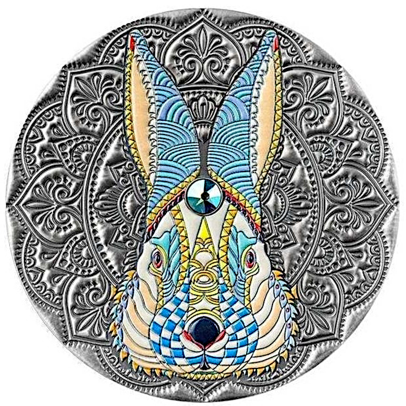 Ta wyjątkowa srebrna moneta o wadze 2 uncji jest częścią serii Mandala Art i jest poświęcona Rokowi Królika. Rewers monety przedstawia stylizowany wizerunek królika, stworzony przy użyciu druku cyfrowego i ozdobiony wzorami mandali i kryształami Swarovskiego. Moneta wyróżnia się starannie przemyślaną kompozycją artystyczną i antycznym wykończeniem, które podkreśla głębię reliefu. Moneta jest prezentowana w eleganckim etui i towarzyszy jej certyfikat autentyczności. Nakład jest ściśle ograniczony do 500 sztuk na całym świecie.