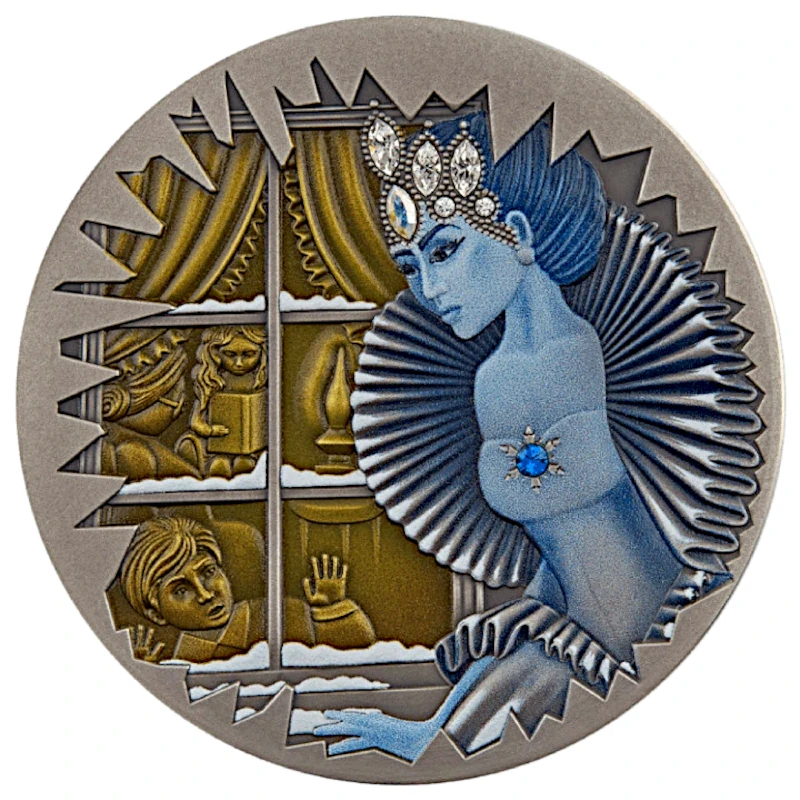 Ta wspaniała srebrna moneta o wadze 1 uncji jest częścią serii Fairy Tales i jest poświęcona legendarnej Królowej Śniegu. Projekt przedstawia magiczną scenę: w ciepłym i przytulnym pokoju babcia opowiada bajki swoim wnukom przy delikatnym świetle lampy naftowej, podczas gdy za oknem króluje zimny majestat Królowej Śniegu. Moneta charakteryzuje się efektownym reliefem, częściowo kolorową emalią, wykończeniem w stylu antycznym i elegancką kryształową wkładką. Moneta jest dostarczana w etui z certyfikatem autentyczności. Limitowany nakład wynosi tylko 1000 sztuk na całym świecie.