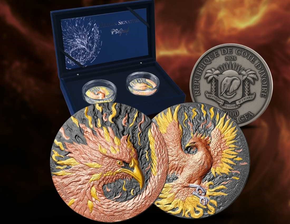 Ten ekskluzywny zestaw dwóch srebrnych monet o wadze 5 uncji stanowi debiut serii Édition Signature od renomowanego atelier P. De Greef i jest poświęcony majestatycznemu feniksowi, ponadczasowemu symbolowi odrodzenia i transformacji. Rewersy przedstawiają dwie potężne interpretacje feniksa: jedna moneta przedstawia ptaka w dynamicznym locie, ogarniętego płomieniami, podczas gdy druga oferuje dramatyczne zbliżenie podkreślające przeszywające spojrzenie mitycznego stworzenia. Artystyczny projekt został stworzony przez Benny'ego Debackera, z uderzającą kompozycją wysokiej płaskorzeźby, starannie ręcznie wykończoną żółtym i różowym złotem, białym rodem i czarnym rutenem. Monety są prezentowane w wysokiej jakości etui upominkowym i towarzyszy im certyfikat autentyczności. Nakład jest ściśle ograniczony do 500 zestawów na całym świecie.
