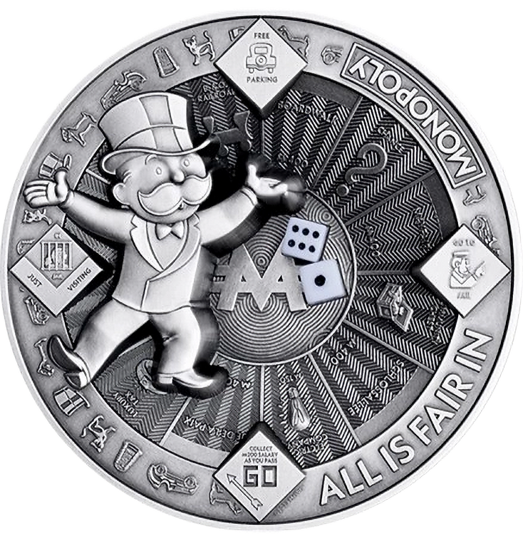 Ta oszałamiająca srebrna moneta o wadze 10 uncji upamiętnia 90. rocznicę kultowej gry Monopoly, która łączy rodziny i przyjaciół na całym świecie. Moneta została wybita w wielowarstwowym procesie menniczym, który tworzy spektakularny efekt 3D i jest uzupełniony prawdziwą kością 3D. Projekt przedstawia ukochanego pana Monopoly i kultowe elementy planszy do gry. Moneta jest dostarczana w etui demonstracyjnym z certyfikatem autentyczności. Nakład jest ściśle ograniczony do 250 egzemplarzy na całym świecie.
