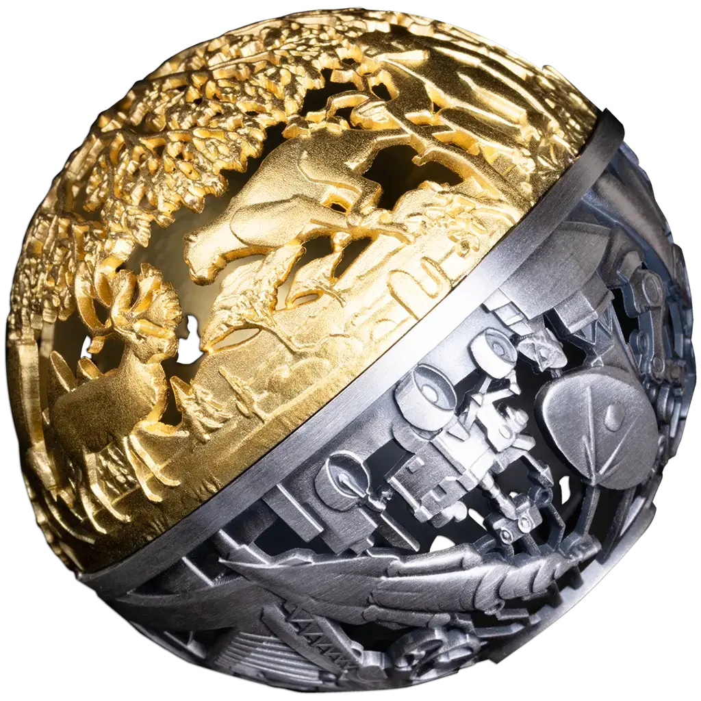 Ta wyjątkowa srebrna moneta sferyczna o wadze 2 uncji uosabia harmonię między pierwotnymi siłami natury a szybkim postępem technologicznym ludzkości. Jej niezwykły kształt wzmacnia koncepcję równowagi, nadając projektowi wyraźnie futurystyczny i niezapomniany charakter. Antyczne wykończenie, w połączeniu z ultra drobnym filigranem i 24-karatowym złotem, podkreśla głębię artystycznej koncepcji i kunszt wykonania. Moneta jest dostarczana w etui z certyfikatem autentyczności. Limitowany nakład wynosi jedynie 1499 sztuk na całym świecie.