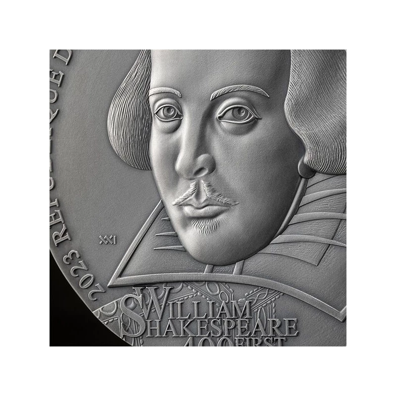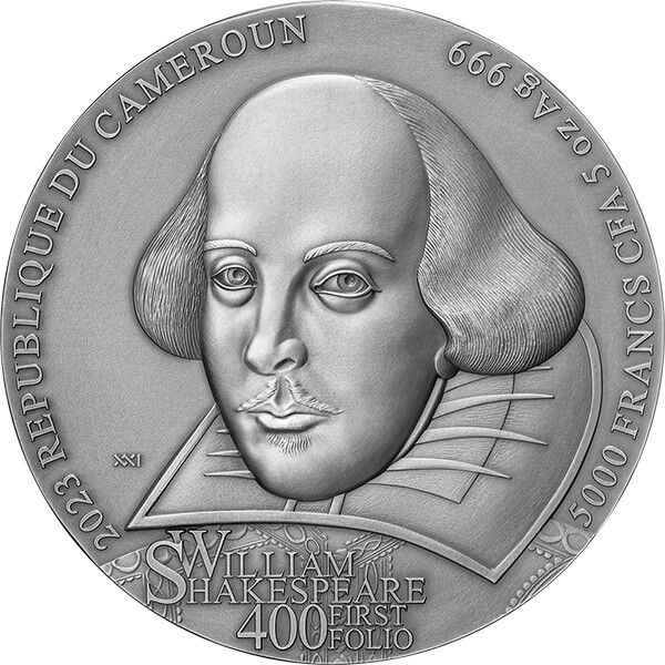 Srebrna moneta Kamerun "Pierwsze folio. William Shakespeare" 2023, 155,5 g czystego srebra (próba 0,999)