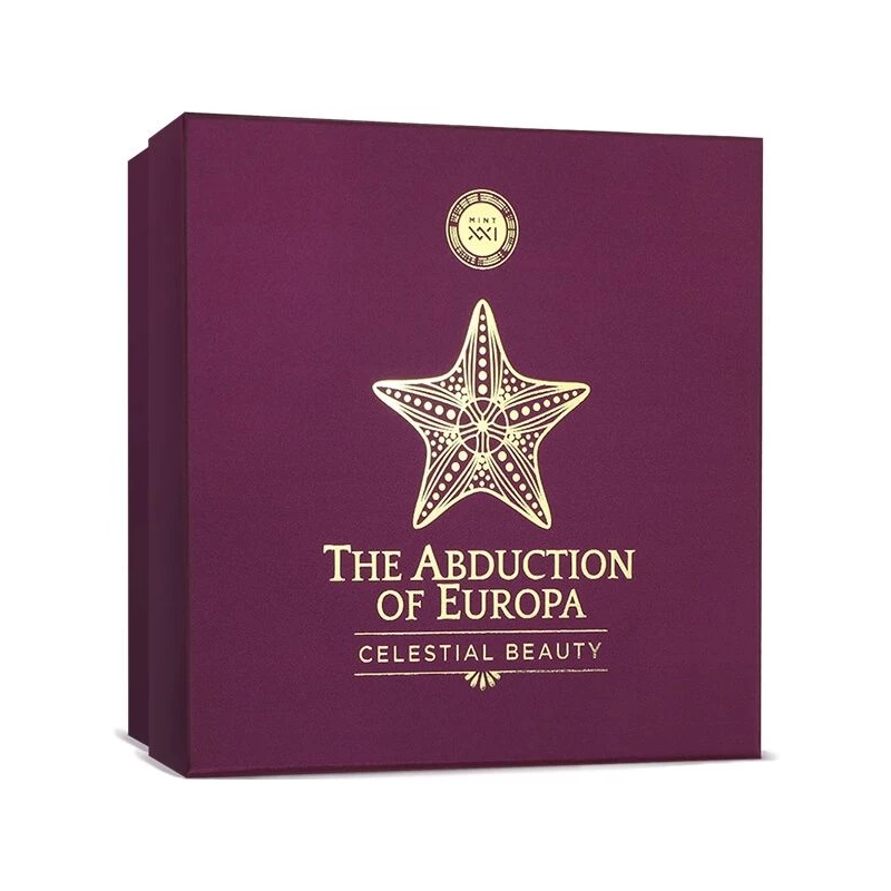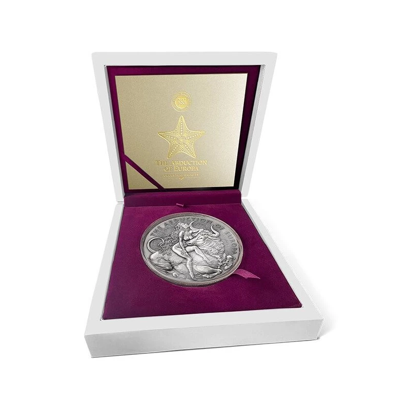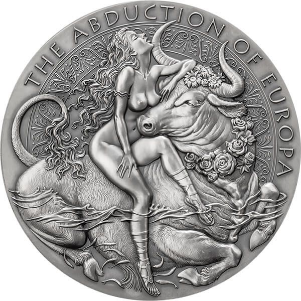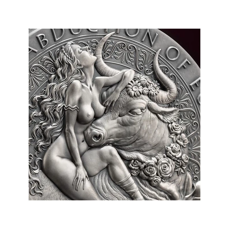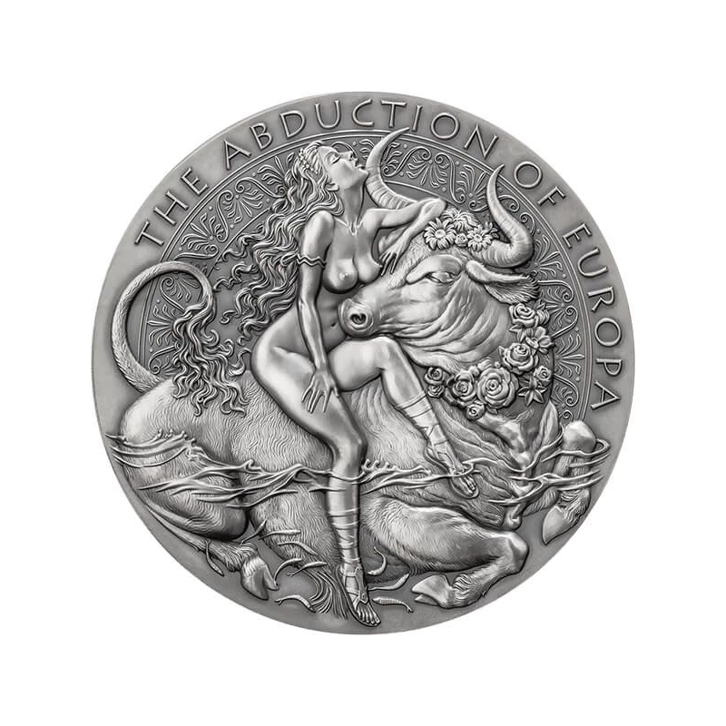 Unikalna srebrna moneta z Kamerunu przedstawiająca porwanie młodej i pięknej córki fenickiego króla, Europy. Według starożytnych opowieści i legend, Zeus, bóg piorunów, grzmotów i nieba, bardzo polubił tę młodą dziewczynę i zamienił się w potężnego białego byka i porwał ją, gdy ona i jej przyjaciele bawili się na brzegu morza. Europa wspięła się na grzbiet byka, a Zeus w postaci tego właśnie byka zabrał ją na Kretę. To właśnie ten moment, moment porwania, jest przedstawiony na srebrnej monecie Kamerunu.