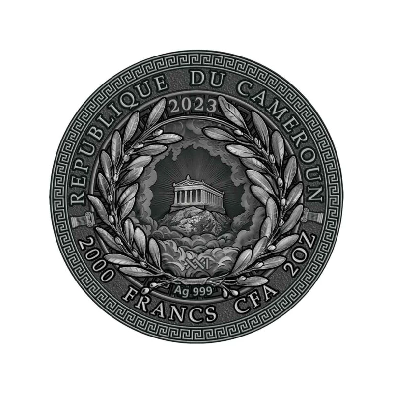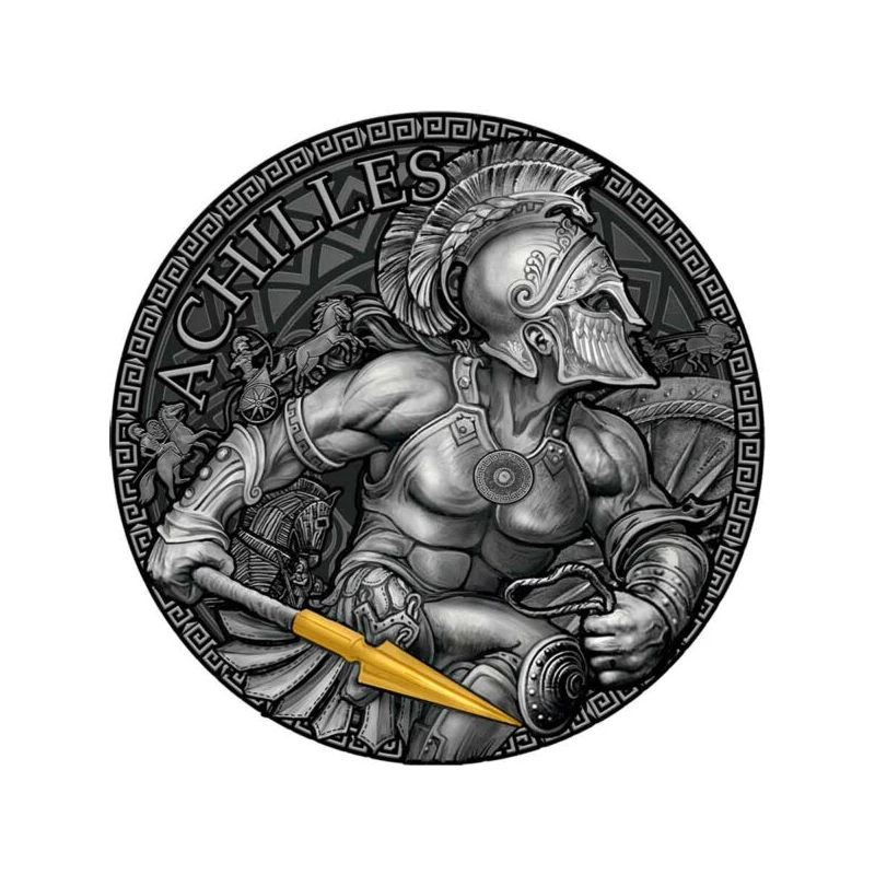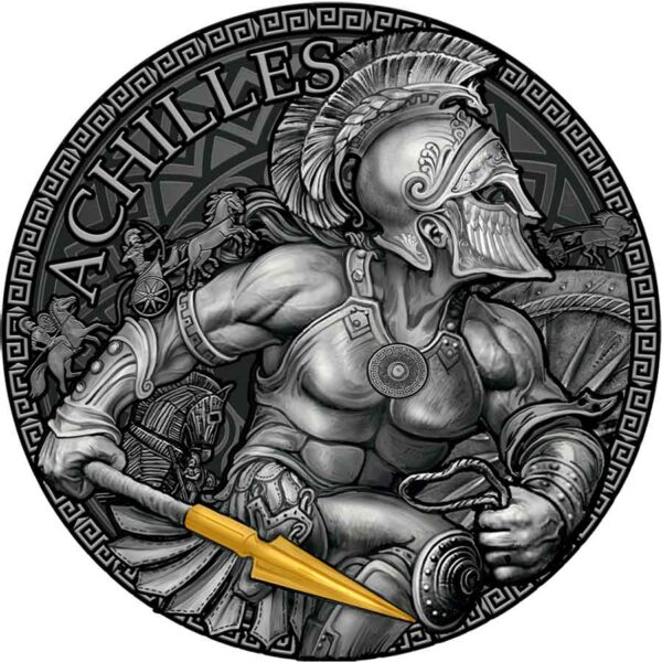 Unikalna srebrna moneta Kamerunu przedstawia wielkiego wojownika Achillesa, którego nikt nie mógł pokonać. Nosi hełm bojowy, tarczę i swoją wierną włócznię.