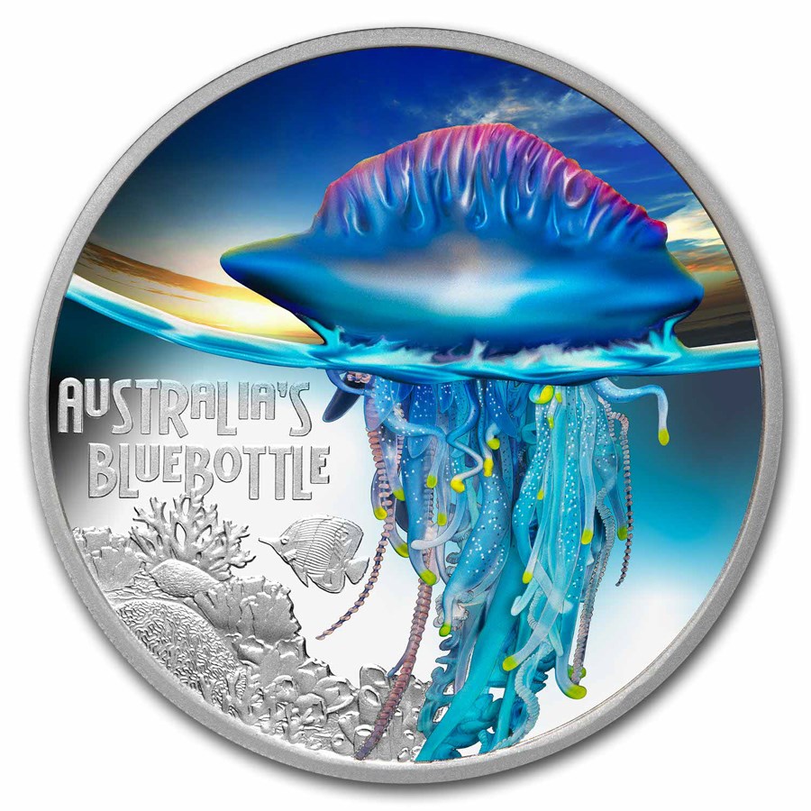 Srebrna moneta Niue "Meduza - Niebieska butelka" (próbna, kolorowana) 2024, 31,1 g czystego srebra (próba 0,9999).