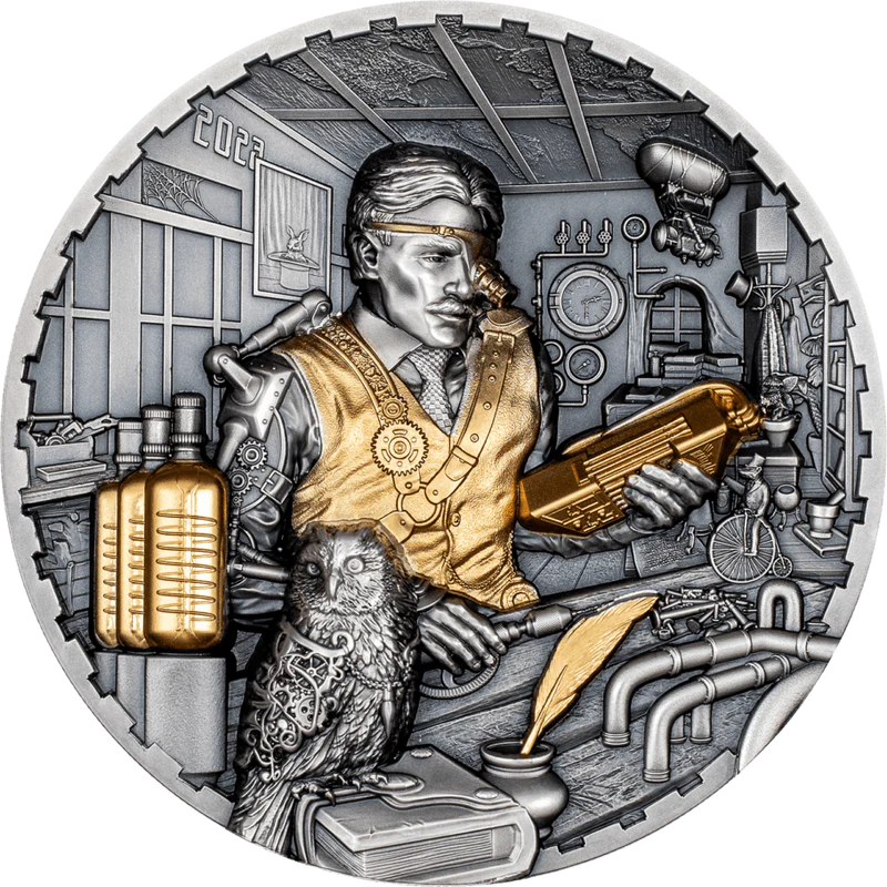 Srebrna moneta z Wysp Cooka "Steampunk. Laboratorium naukowe", (ultra, high relief), 2023, 93,3 gr., czyste srebro (0,999 proof)