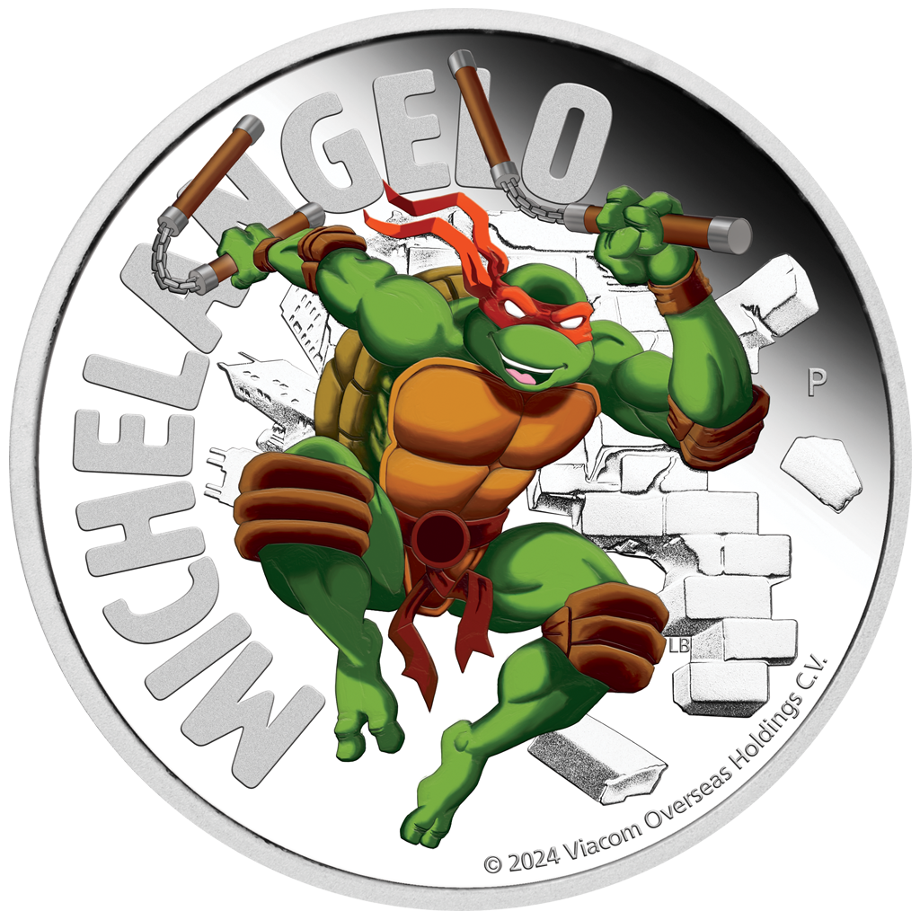 Ta srebrna moneta o wadze 1 uncji upamiętnia Michelangelo, jednego z najsłynniejszych Żółwi Ninja. Przedstawia jaskrawo kolorowy wizerunek postaci w dynamicznym ruchu, gotowej do ataku swoim nunchaku. Moneta ma status Proof i jest dostarczana w specjalnym etui wraz z certyfikatem autentyczności. Limitowany nakład wynosi tylko 5000 sztuk na całym świecie.