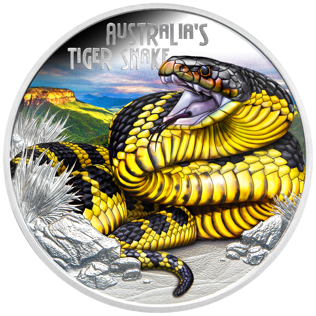 Srebrna moneta Tuvalu "Śmiertelny i niebezpieczny. Wąż tygrysi" 2025 (proof, kolorowana), 31,1 g czystego srebra (0,9999 proof)