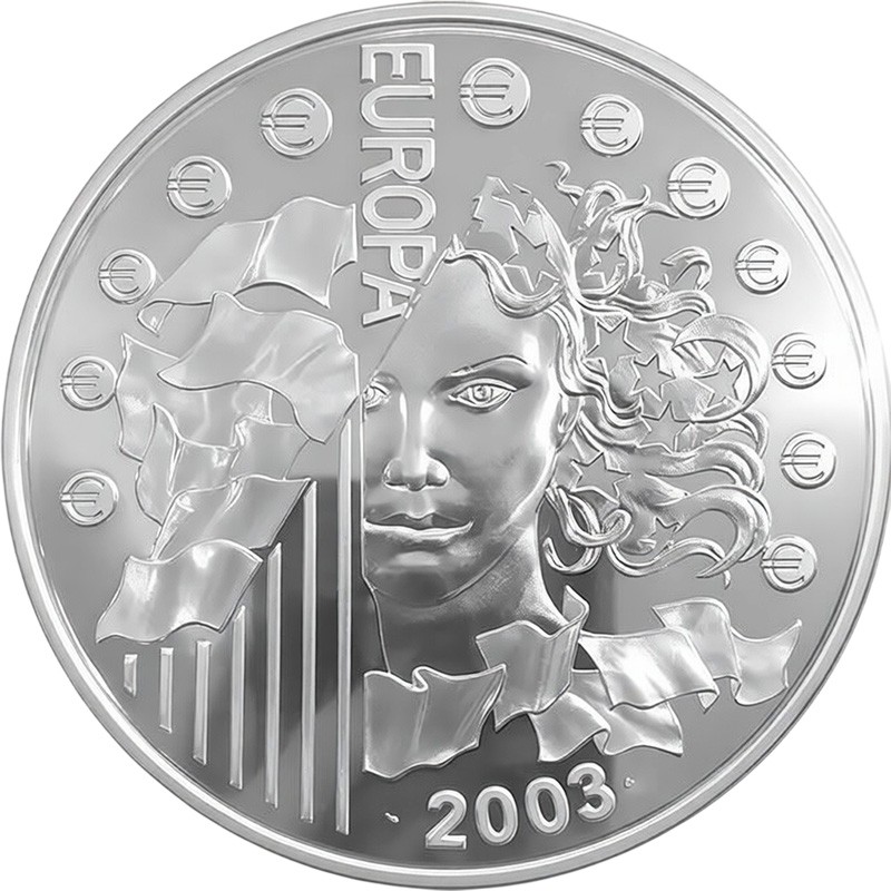 Wyemitowana przez Monnaie de Paris srebrna moneta kolekcjonerska upamiętnia pierwszą rocznicę wprowadzenia euro jako wspólnej europejskiej waluty. Wybita w jakości Proof ze srebra o próbie 0,925, moneta zawiera 925 g czystego srebra i ma średnicę 100 mm. Nominał wynosi 50 euro, a nakład jest ograniczony do 10 000 sztuk. Awers czerpie inspirację ze sztuki minojskiej, przedstawiając motywy ośmiornicy i nazwy dwunastu krajów strefy euro. Widnieje na nim również nominał i napis RÉPUBLIQUE FRANÇAISE. Rewers przedstawia portret bogini Europy z gwiazdami wplecionymi we włosy, wraz z napisem EUROPA i rokiem 2003. Moneta ta jest prawnym środkiem płatniczym w Republice Francuskiej i jest wydawana z certyfikatem autentyczności.