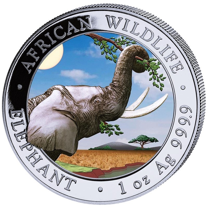 Ta srebrna moneta kolekcjonerska z 2023 roku z Somalii należy do serii African Wildlife i została wybita z 1 uncji srebra o próbie 0,9999. Wzbogacona o żywy, kolorowy wzór dzienny, moneta wnosi świeży wymiar wizualny do dobrze znanej serii. Wybita w Bawarskiej Mennicy Państwowej w Niemczech, odzwierciedla wysoki poziom rzemiosła i drobnych szczegółów. Rewers przedstawia głowę dorosłego słonia z trąbą owiniętą wokół gałęzi, na tle jasnego i malowniczego afrykańskiego krajobrazu. Corocznie zmieniający się motyw słonia zapewnia, że każde wydanie pozostaje charakterystyczne i bardzo poszukiwane przez kolekcjonerów.