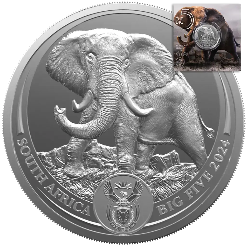 Moneta Słoń z 2024 roku to pierwsza emisja z nowej serii Wielkiej Piątki III Mennicy Południowoafrykańskiej. Moneta została wybita z 1 uncji srebra próby 0,999 w jakości nieobiegowej i ma nominał 5 randów oraz limitowany nakład 10 000 sztuk. Moneta jest dostarczana w oryginalnym opakowaniu typu blister. Awers monety przedstawia dorosłego słonia afrykańskiego, któremu towarzyszą napisy "SOUTH AFRICA", "BIG FIVE 2024" i godło narodowe. Rewers przedstawia dwie połówki głowy słonia; gdy dwie monety zostaną umieszczone obok siebie, pojawi się pełny portret w zbliżeniu. Ułożenie kilku monet tworzy wizualne wrażenie całego stada. W środkowej części umieszczono nominał "FIVE RAND", wagę "1OZ" i próbę "Ag 999".