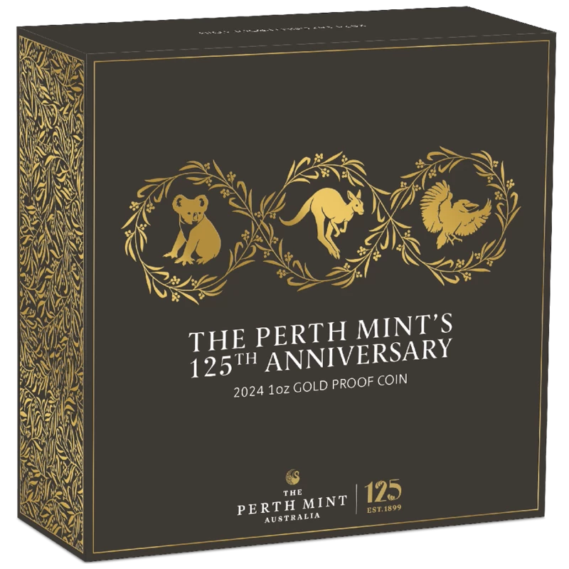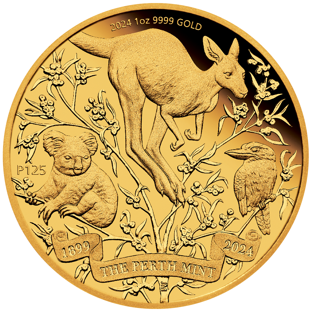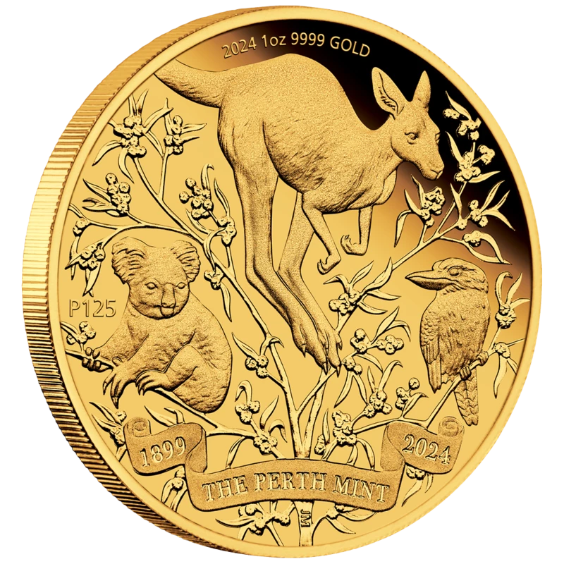 Australijska złota moneta "125-lecie mennicy Perth: Koala, Kangur, Kookabarra" (dowód), 2024, 31,1 g czystego złota. (Próba 0,9999)