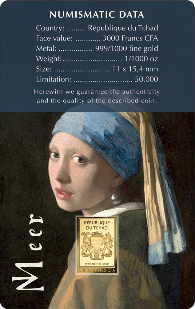Złota moneta Chada "Dziewczyna z perłą" (próbna), 0,031 g czystego złota (próba 0,999)