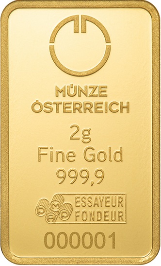 2 gramy czystego złota (0,9999) w formie sztabki od jednego z najbardziej renomowanych producentów - Mennicy Austriackiej. Sztabka jest bita (nie odlewana) i zapakowana w blister z certyfikatem.